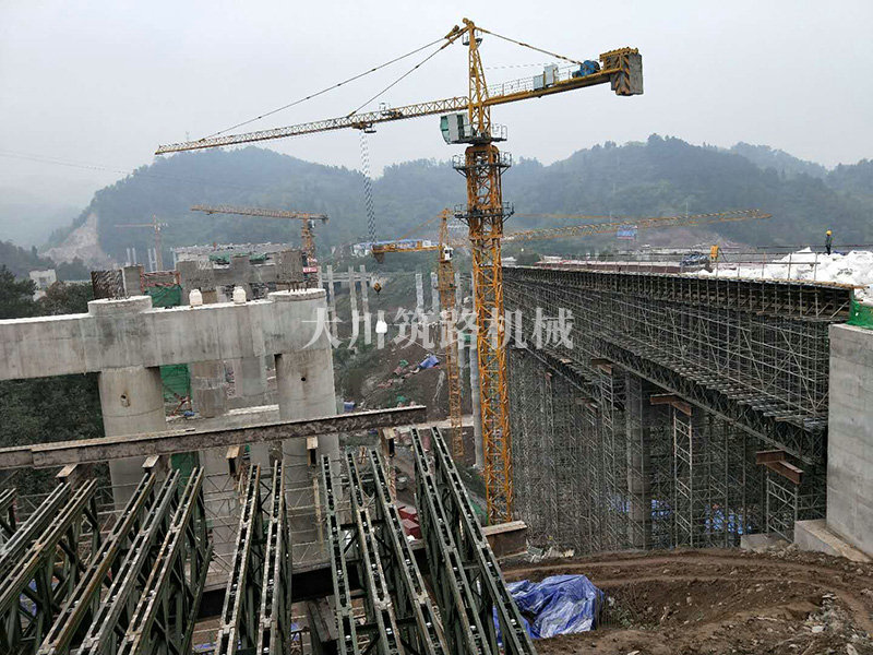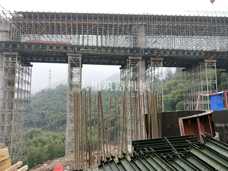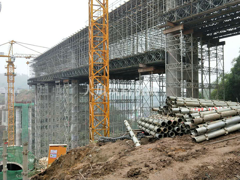 特點(diǎn):現(xiàn)澆梁支架平臺(tái)的跨度大,高度高,使用的貝雷片數(shù)量達(dá)到1808片,加強(qiáng)弦桿2800根,工程于2017年9月開(kāi)始施工。